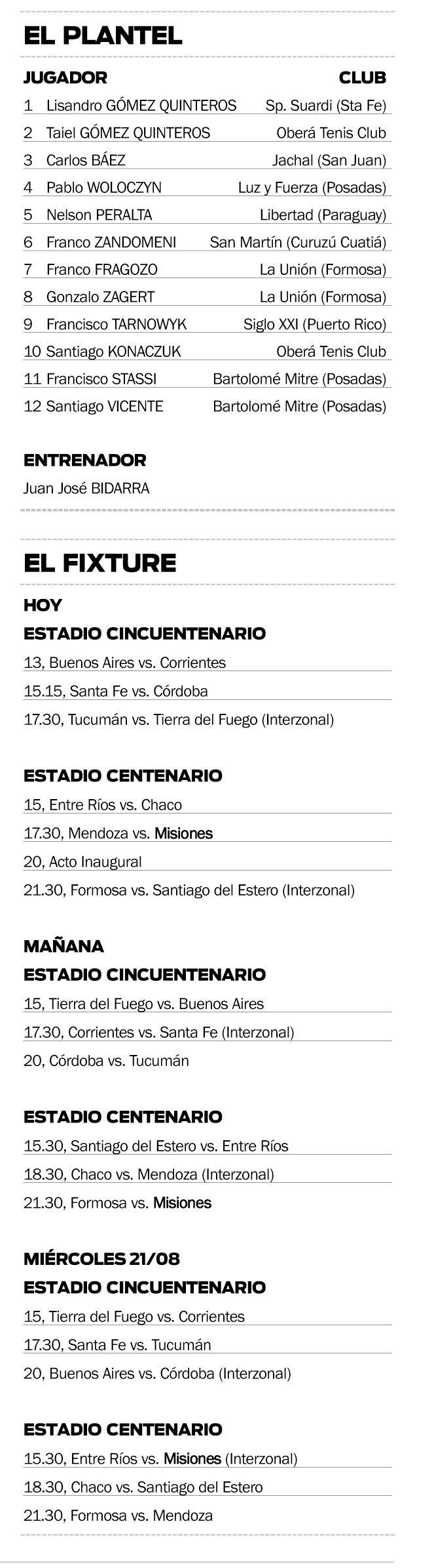 La Selección Misionera, dirigida por el mítico Juan José “Huevo” Bidarra, conforma el grupo B junto al representativo local y Mendoza. Justamente, el debut será hoy desde las 17.30 ante los cuyanos. Mañana, por la segunda fecha, se vendrá Formosa y el cierre del grupo será el miércoles ante Entre Ríos, actual subcampeón, en el partido interzonal.