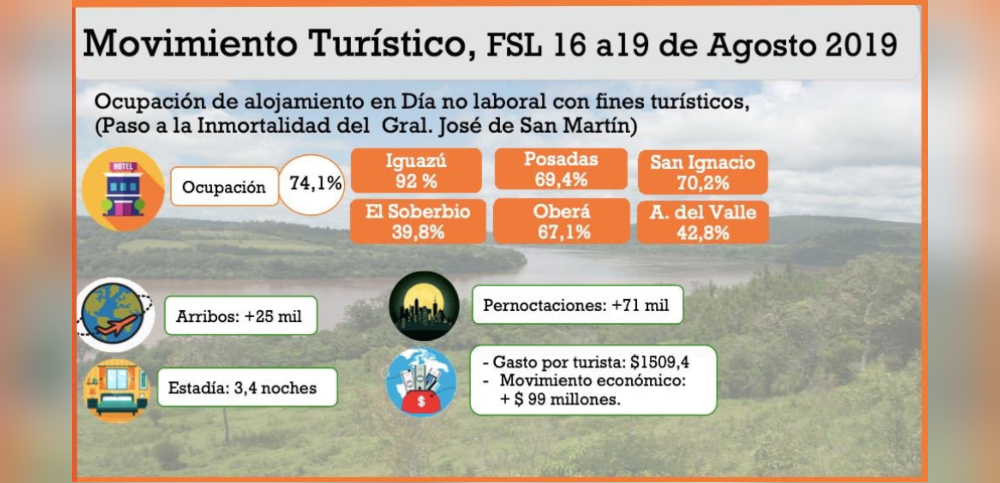 Durante el fin de semana largo con fines turísticos que pasó (por el Paso a la Inmortalidad del Gral. José de San Martín), el movimiento económico en Misiones pasó los 99 millones de pesos. Mientras que la ocupación total estuvo en 74%, según informó el Ministerio de Turismo de la provincia.