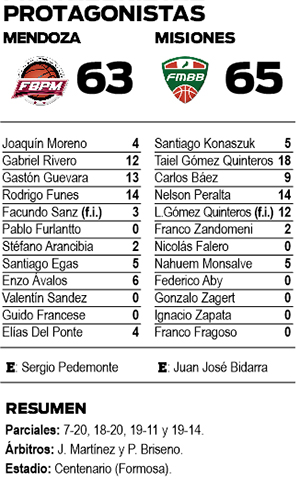 Parecía que en los dos últimos parciales, la historia sería pan comido para Misiones. Pero Mendoza cambió el ritmo durante ese complemento y llevó al desorden a los embajadores de la tierra colorada, al punto que los mendocinos se pusieron uno arriba y bien pudieron haberlo ganado, pero finalmente la Selección se impuso 65-63, no sin suspenso en los segundos finales.