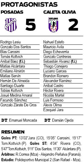 El 2-1 generó alivio pero en el complemento, nuevamente la tensión. Es que a los 4’04” Héctor Rivera la empujó ante el bueno de Rodrigo Lesiu y volvió a poner las cosas como en el inicio. 2-2. Esta vez, Posadas no cometió los errores del principio y, decidido a sumar de a dos, fue y fue hasta que encontró su merecido. Otra vez Kottvich, Gonzalo Dos Santos y Matías Alcántara definieron y disiparon cualquier duda sobre el triunfo de los posadeños por 5-2.