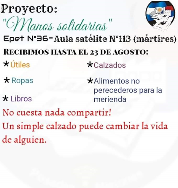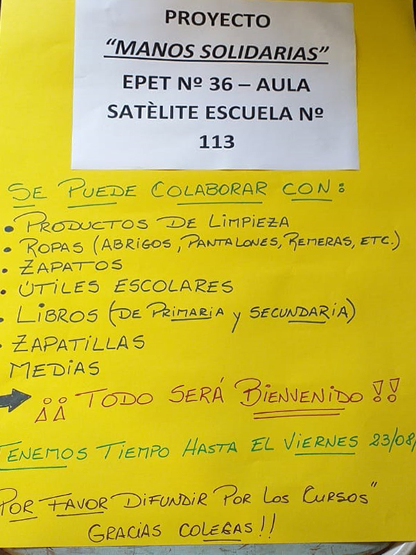 Ahora el proyecto se presentará en el Consejo de Educación, que deberá dar el visto bueno para que los docentes y alumnos de la EPET 36 puedan viajar a Mártires a llevar lo recolectado.