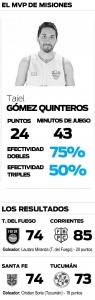 Misiones se encontró nuevamente en desventaja, pero falta de 17 segundos para el cierre, Taiel Gómez Quintero, la figura del partido, clavó un triple que mandó al frente a los de la tierra colorada y luego supo aguantar para llevarse este enorme triunfo.