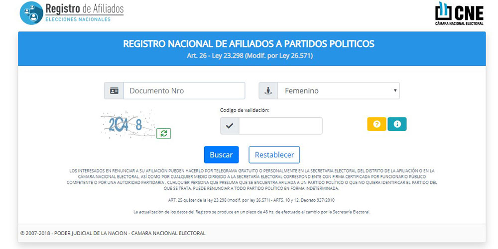 “El registro de afiliados es público y está constituido por el ordenamiento actualizado de las fichas de afiliación. Su organización y funcionamiento corresponde a los partidos políticos y a la justicia federal con competencia electoral”, establece el artículo 26 de la Ley Orgánica de los Partidos Políticos.