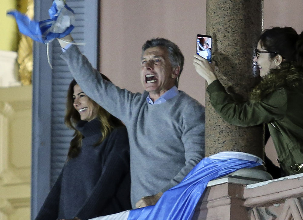 Macri tuvo dos apariciones en el balcón de la Rosada, en la primera a las 19, entre vivas a la patria y cánticos de apoyo a su gestión, junto a la primera dama Juliana Awada y, visiblemente emocionado, saludó a la multitud, con sus brazos en alto, con una bandera argentina y varias veces se llevó la mano al corazón.