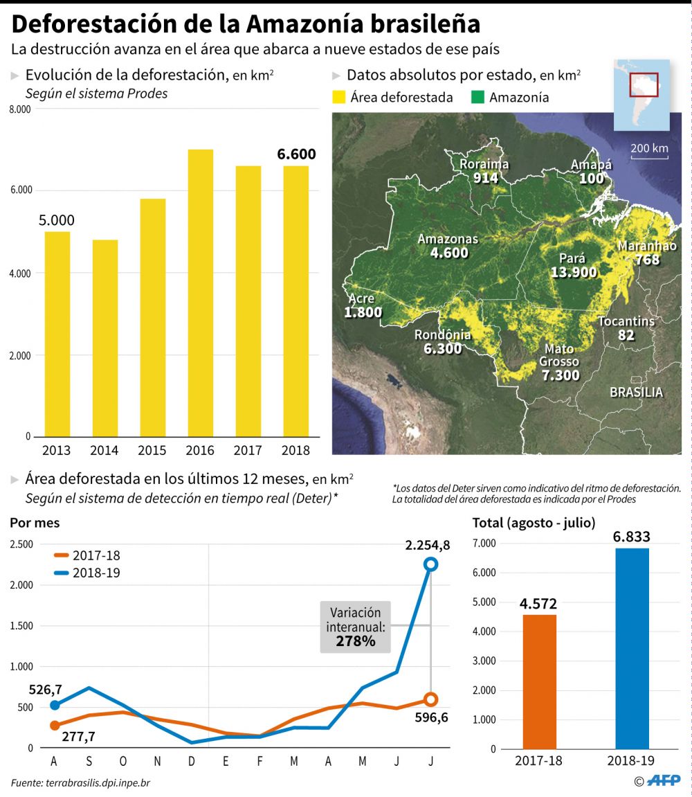 Según las últimas cifras, en Brasil han sido detectado 79.513 incendios desde el inicio del año, de los cuales algo más de la mitad en la Amazonía. Presionado por la comunidad internacional, Brasil acabó por entrar en acción el domingo, enviando a la zona en llamas dos aviones C-130 Hércules.