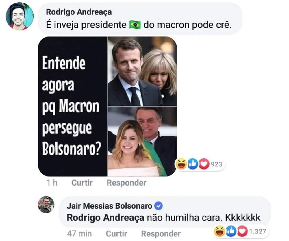 “Ahora entienden por qué Macron persigue a Bolsonaro“, escribió un usuario de Facebook junto a las fotos de las dos parejas presidenciales. “Apuesto a que son los celos de Macron“, añadió.