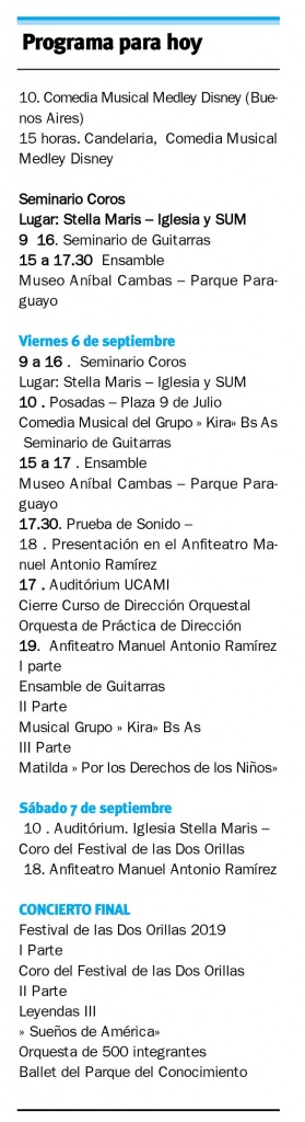 Vale recordar que el festival se lleva a cabo en distintos puntos de la provincia. El 7 de septiembre será el concierto final en el anfiteatro Manuel Antonio Ramírez a partir de las 18. Además, durante las jornadas, habrá cursos y seminarios gratuitos con importantes maestros.