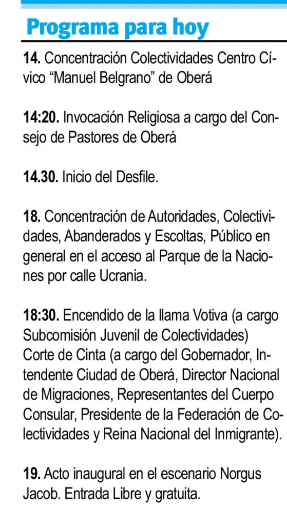 También a los vicecónsules honorarios Juan Manuel Carro Fernández, de España, y Edgardo Aníbal Belloni y Ricardo José Lubary de Italia. Finalmente al cónsul jefe de misión, Magno Álvarez, de Paraguay. En tanto hoy a partir de las 14.30, partirá desde el Centro Cívico de la ciudad el tradicional desfile de las colectividades hacia el Parque de las Naciones.