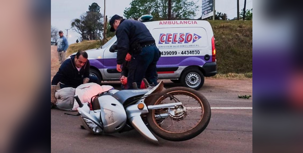 Un Renault Kangoo, ambulancia del centro de salud privado “Celso”, impactó a una motocicleta Corven sobre el kilóemetro 968 de la ruta nacional 14, entre Dos de Mayo y San Vicente. El siniestro dejó como saldo al hombre del rodado menor con heridas de levedad.