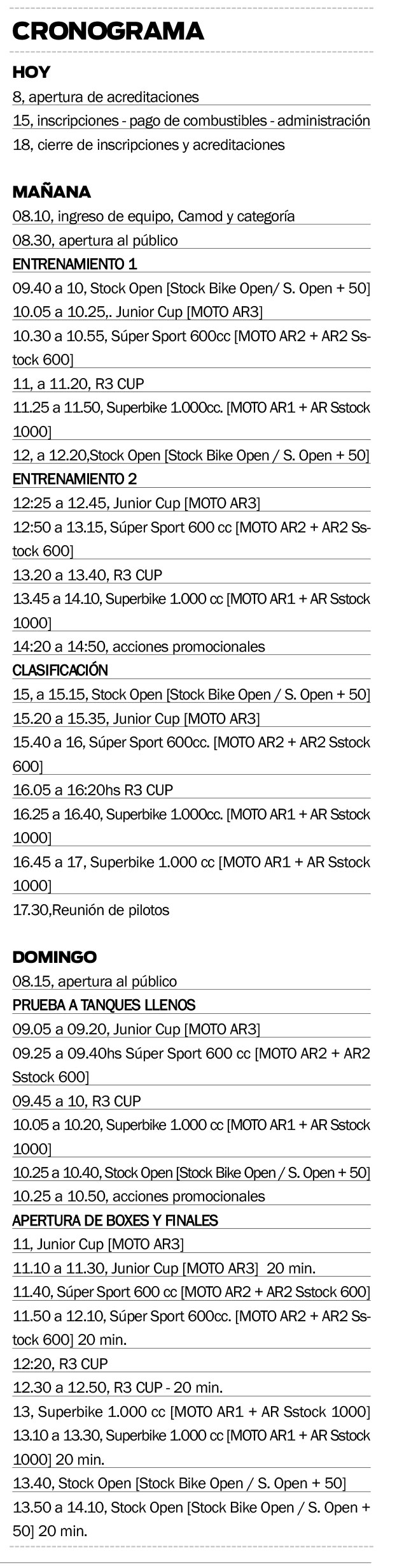 En el cronograma que dio a conocer la organización indica que hoy será una jornada de trámites administrativos; mientras que mañana comenzará lo bueno con los entrenamientos de las distintas categorías y las clasificaciones. El domingo será el plato fuerte de la jornada con la disputa de las finales.