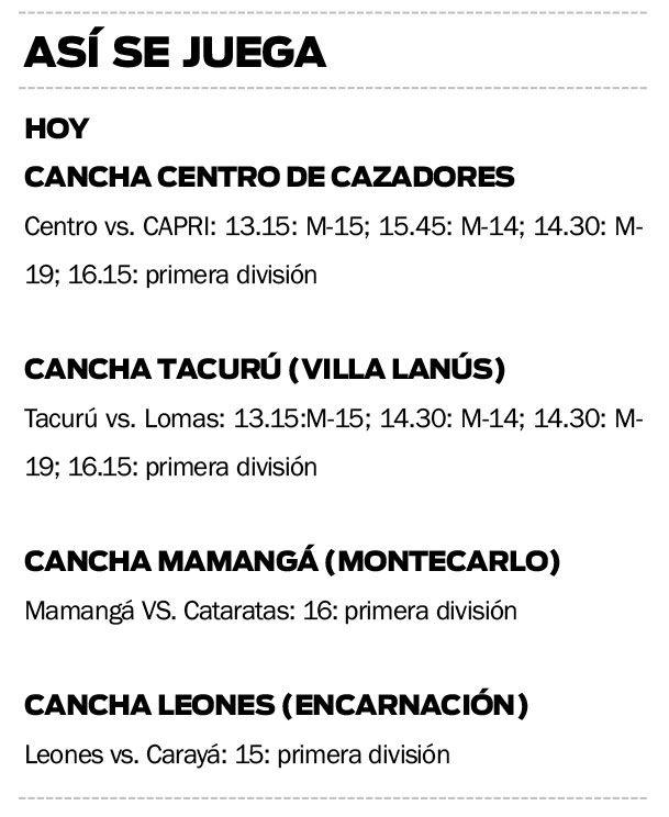 Mientras, por la Zona Norte, desde las 15 y en Montecarlo, el local Mamangá recibirá la visita de Cataratas Rugby Club, mientras que en idéntico horario y por la misma zona, Leones de Encarnación será local en la vecina ciudad paraguaya ante Carayá de Eldorado.