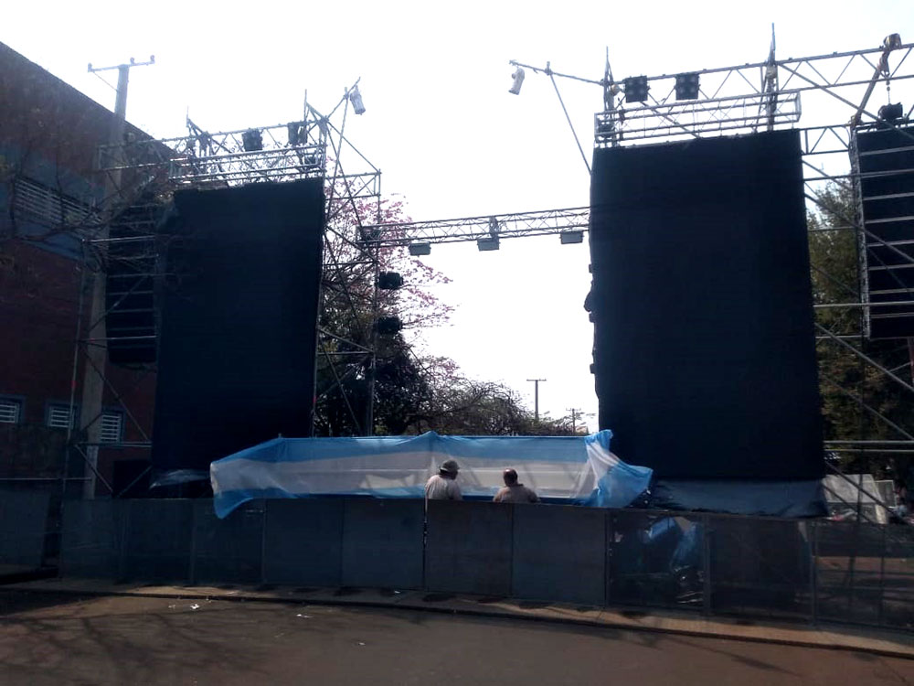 El equipo técnico terminó de armar el escenario frente al complejo, mientras se realizan las pruebas de sonido correspondientes.
