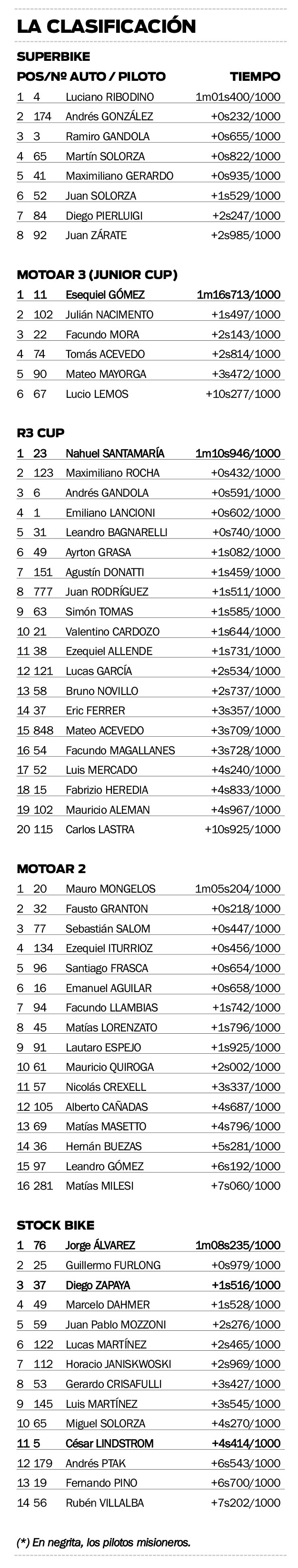 Además, en la categoría más potente, la Superbike, el cordobés Luciano Ribodino, del misionero Rosamonte Team, también se quedó con el mejor tiempo.