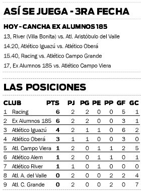 Uno de los equipos punteros, con seis unidades, es Racing de Villa Svea, que quiere seguir con ese impulso logrado a fuerza de goles. Pero para ello deberá vencer a Atlético Campo Grande, que aún no logró resultados positivos y busca dar vuelta esa realidad, por lo que será un hueso duro de roer.