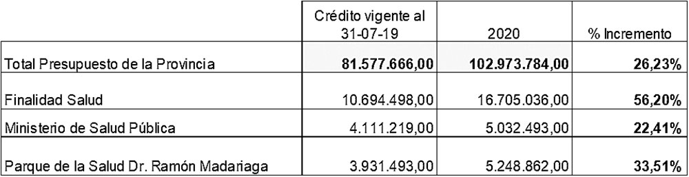 La previsión del presupuesto de Salud Pública para 2020 representa el 16,2% respecto del total provincial, según se desprendió de la exposición del ministro de Salud, Walter Villalba, ante diputados y miembros de su cartera, durante el análisis de fondos realizado ayer en la comisión de Presupuesto de la Legislatura.