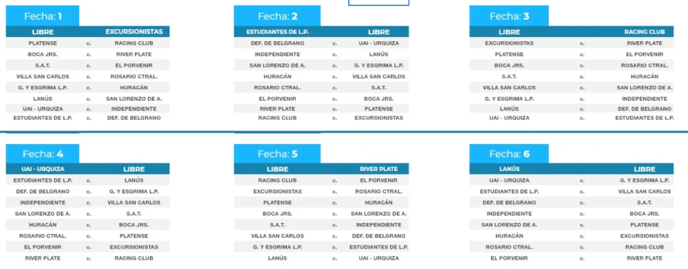 La primera fecha, que dejó libre a Excursionistas, será de la siguiente manera: Platense – Racing, Boca – River, SAT – El Porvenir, San Carlos – Rosario Central, Gimnasia (LP) – Huracán, Lanús – San Lorenzo, UAI Urquiza – Independiente y Estudiantes (LP) – Def. de Belgrano