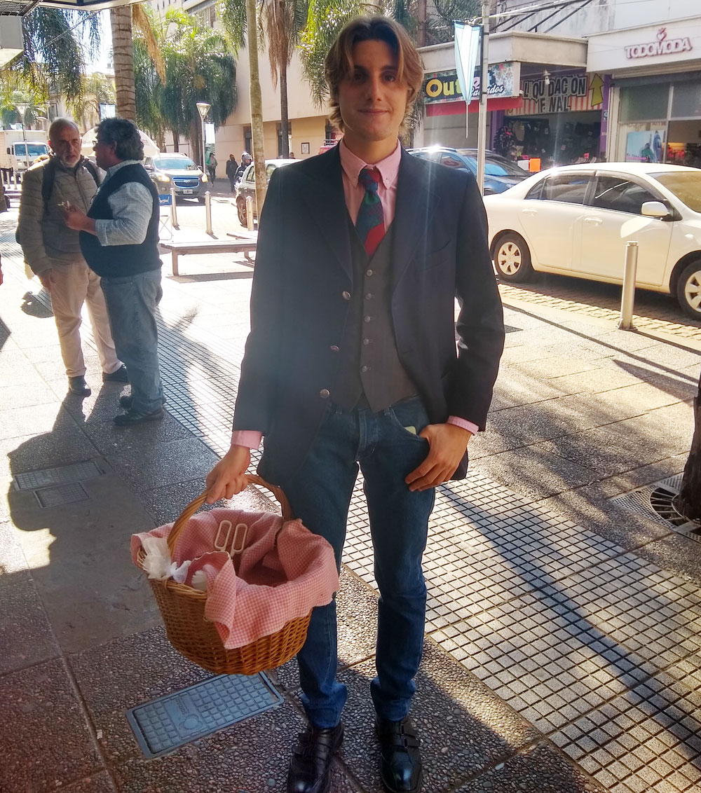 Es normal verlo con un canasto tradicional de chipero, pero vestido de forma elegante, con traje, corbata, finos zapatos, una presencia a todas luces destacable. Sobre esto, contó que obedece a varias razones. “Por un lado que en la escuela en la que estudié la secundaria se usaba traje, así que esa era la ropa normal de todos los días, es una ropa que uso desde los 13 años; pero por otro lado, un amigo que vende en Buenos Aires, me lo recomendó porque él vende así y me dijo que le ayudó en sus ventas. Además, aunque yo me compro ropa porque me gusta y aprovecho todas las ofertas que encuentro, de todos modos hay gente que me ayuda, que me regala, porque sino, no podría ya que esta ropa es muy cara. En particular, hay una señora que me regaló muchos trajes y zapatos, gracias a esa señora tengo mucha ropa, le estoy muy agradecido”, contó.