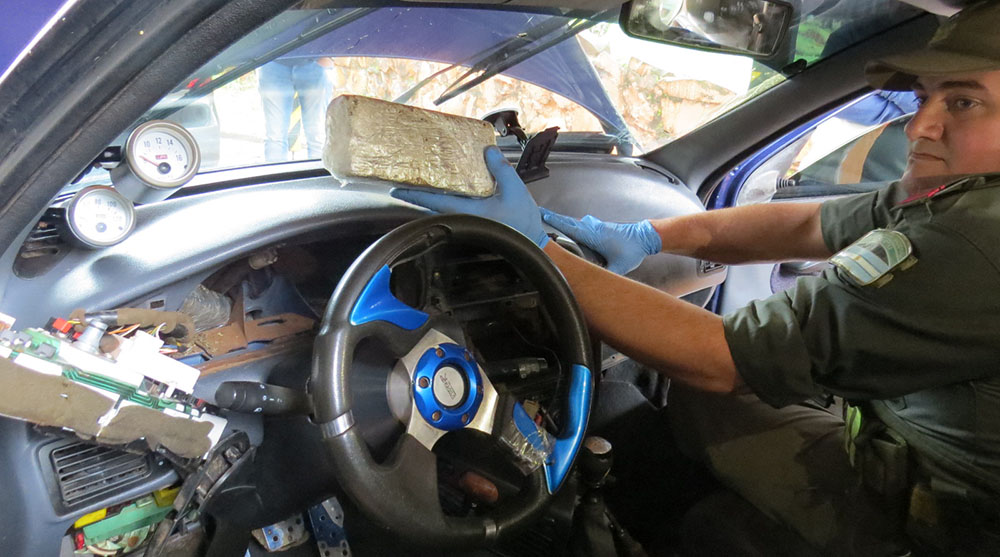 Tras la requisa del perro “Dalí”, los uniformados incautaron 1,138 kilogramos de cocaína y 19,201 de cannabis sativa, todo acondicionado en compartimentos del torpedo y puertas del Fiat Palio.