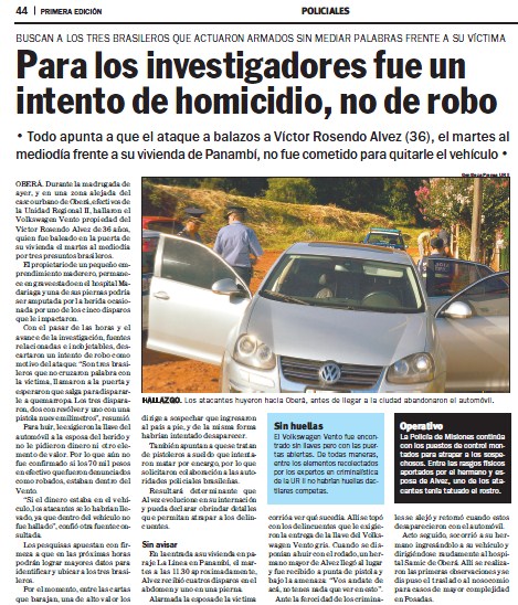 Paraje La Línea, en las afueras de Panambí. Eran aproximadamente las 11.30 del 19 de enero de 2016, cuando tres sospechosos llegaron a la vivienda de Víctor Rosendo Álvez (36). Éste salió para hablar con ellos y sin mediar palabras recibió cuatro tiros en el abdomen y otro en la pierna. Lo atacaron con pistolas calibres 32, 38 y 45.