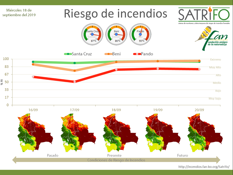 “La superficie quemada en el departamento de Santa Cruz asciende a 3 millones de hectáreas y representa el 74,5% del total de áreas afectadas por incendios a nivel nacional (4,1 millones de ha.), según la estimación realizada a partir de imágenes satelitales de la NASA y ESA, al 15 de septiembre de 2019“, afirmó la FAN en un comunicado.