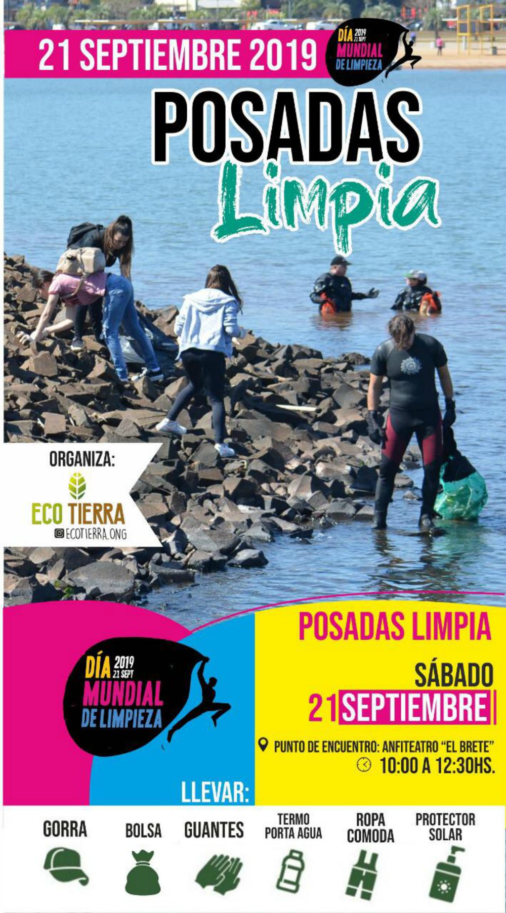 Para actividad principal, los organizadores recomienzan llevar guantes “gorra, protección solar, ropa cómoda y muchas ganas”, dijeron. Todo lo demás le proporcionan allí para hacer la limpieza de la orilla del río Paraná.
