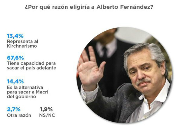 Gustavo Córdoba también aclaró que en la misma consulta preguntaron a los encuestados los motivos por los cuáles votarían al candidato del Frente de Todos. Las opciones eran tres: por ser representante del kirchnerismo, como alternativa a Macri, o por capacidad para sacar el país adelante. “La última opción se llevó prácticamente el 70% de las afirmaciones”, destacó Córdoba y agregó: “Por eso podemos decir con mucha claridad que más que alternativa o representar a algún sector del kirchnerismo, Alberto Fernández es visto como un buen líder para sacar a la Argentina de la crisis que está atravesando”.