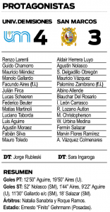 San Marcos pareció reaccionar tras ese tanto y fue en busca del empate, pero nunca pudo con Larenti ni con Mauricio Méndez, el capitán, bien parado en posición de base. Y para colmo, a falta de 10 segundos para el cierre, penal para la UNaM y gol de Facundo Aires desde los seis metros. 2-0 y al descanso.