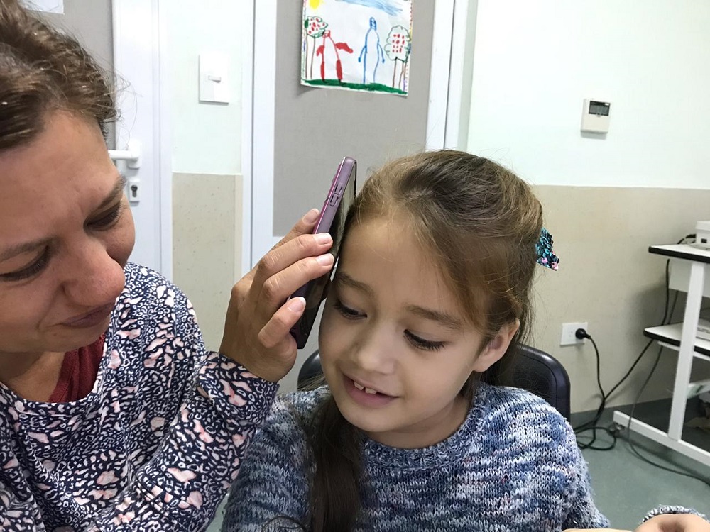 Mia de 8 años oriunda de Posadas, tras el encender el implante coclear escuchó por primera vez la voz de sus seres queridos (su mamá y su hermanita en el consultorio y a su papá por teléfono quien vive en Buenos Aires).