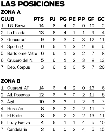 En tanto, en lo que respecta a la zona B, Ágil venció como local a Huracán por 1-0 y quedó tercero, mientras que Atlético Posadas goleó al colero Candelaria por 4-1 y es escolta de Guaraní, que el sábado venció en casa a Luz y Fuerza por 1-0. El próximo finde se disputará la séptima fecha, que resultará clave de cara a la fase final.