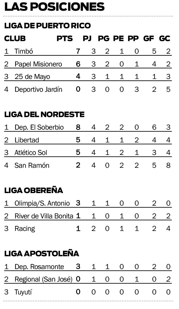 En lo que respecta a la Liga de Puerto Rico, Timbó no pudo romper el cero ante 25 de Mayo, aunque el punto le fue suficiente para despegarse del resto y alcanzar el liderazgo. Sin embargo, el verde debe transitar con cuidado: al final de la primera vuelta, está apenas un punto por encima de Papel Misionero, que derrotó a Deportivo Jardín por 1-0.
