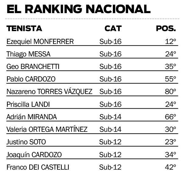 Aunque el desafío es grande, no asusta a Pablo Cardozo (16), Geovani Branchetti (16), Thiago Messa (15) y Priscilla Landi (14), cuatro de los referentes del tenis misionero que se viene, quienes por estas horas se preparan para participar del quinto Torneo Nacional de la Asociación Argentina de Tenis (AAT), que se desarrollará desde el 9 de octubre en San Miguel de Tucumán.