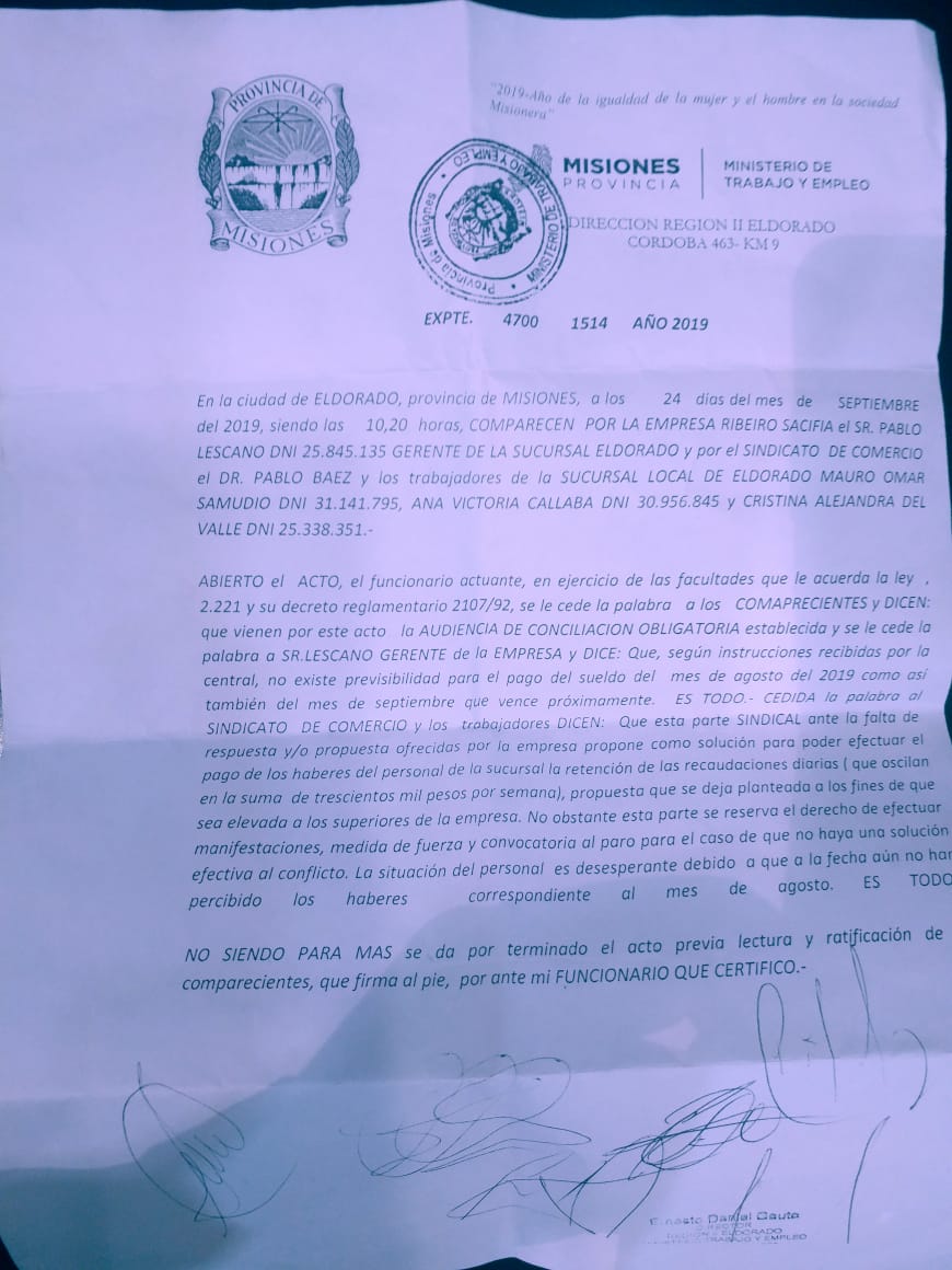 Según manifestaron, la empresa les adeuda una gran parte del salario correspondiente a agosto y aún no tuvieron respuesta sobre el sueldo de septiembre, considerando que está culminando el mes. A nivel nacional, sumergido en una crisis financiera, Ribeiro se encuentra en un Procedimiento Preventivo de Crisis (PPC), situación que generó la alarma de los miles de trabajadores distribuidos en las diversas sucursales por los posibles cierres o despidos masivos.