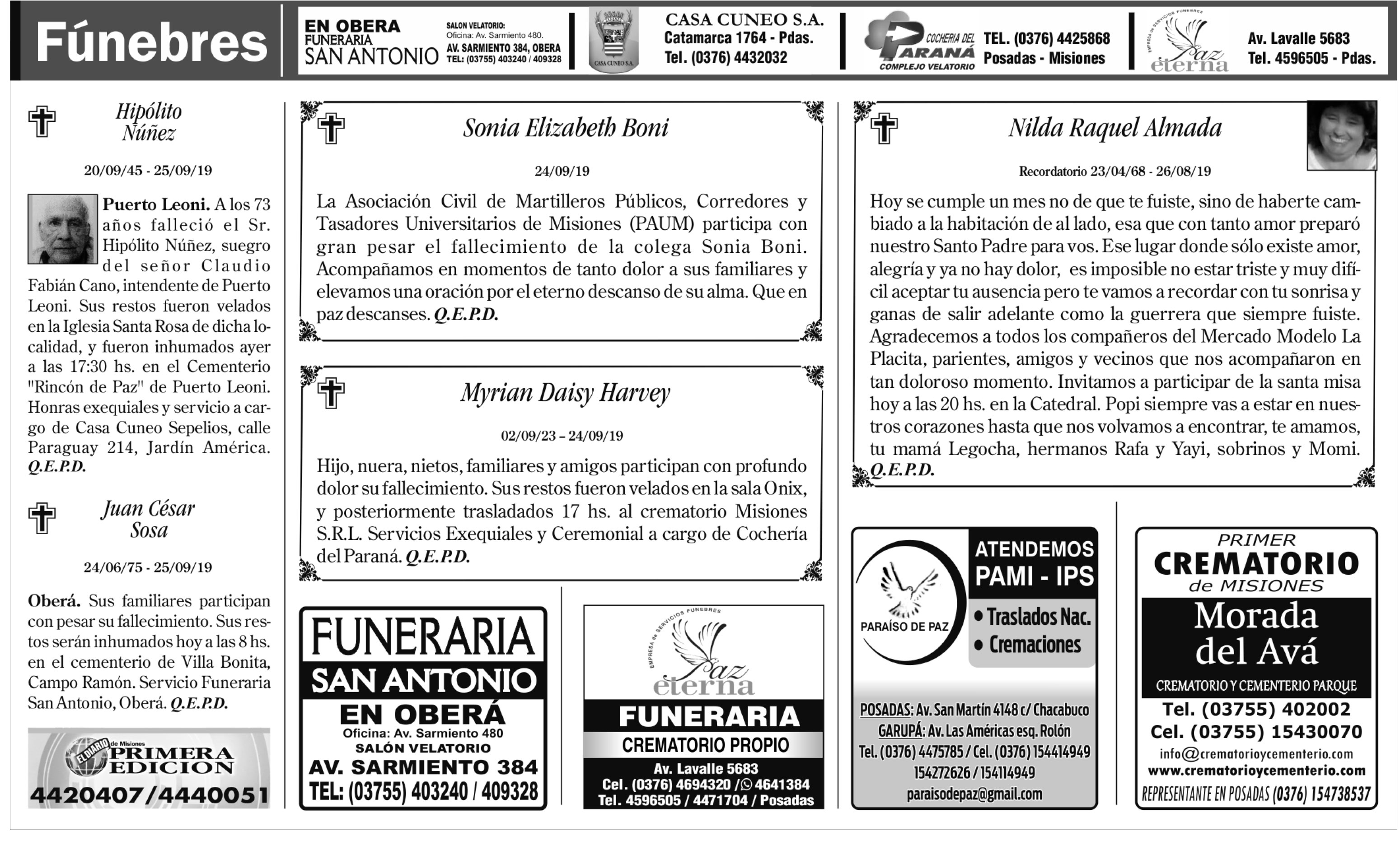 Fúnebres del jueves 26 de septiembre de 2019
