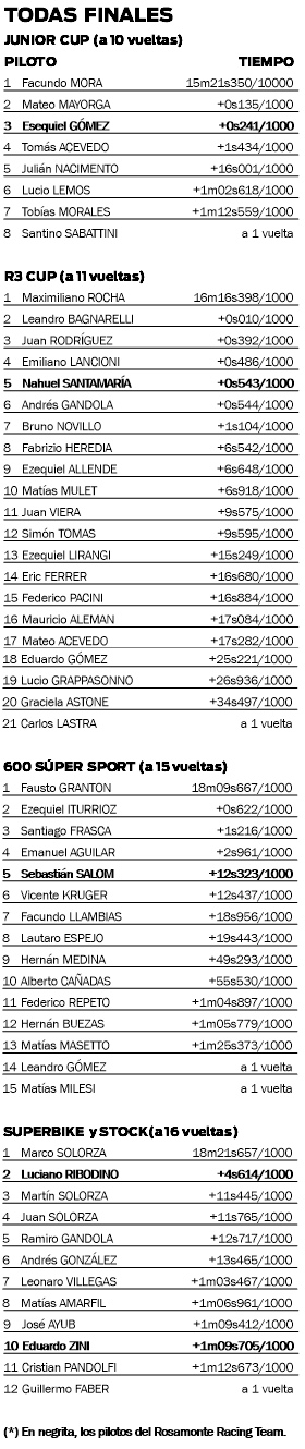 Los otros dos pilotos del Rosamonte también cumplieron. En Stock Bike, el correntino Eduardo “Lalo” Zini culminó cuarto, mientras que en la 600 Súper Sport, el cordobés Sebastián Salom finalizó quinto, en otra carrera inolvidable.