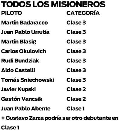 Todos se agregarán a los que habitualmente compiten en esta temporada, como Martín Badaracco, Juan Pablo Urrutia y Martín Blasig (todos en la Clase 3) y Juan Pablo Abente en Clase 1.