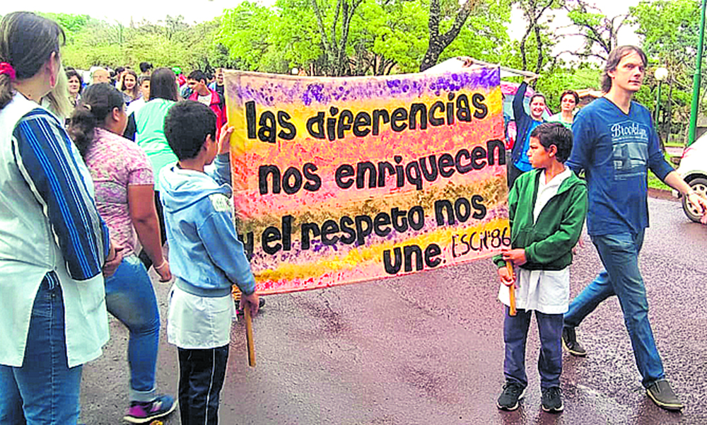 La jornada comenzó con una caminata por las calles de la ciudad, donde la gente compartió con los alumnos que la realizaron cantos “por más inclusión”. Estuvieron los establecimientos que trabajan en ese sentido en la zona como la Escuela 638; la EPJA; las de Adultos 1405, 9055, 1457; la Escuela 86; el NENI 2014; y la Escuela 21, acompañados por la banda del Regimiento Monte 30, del Establecimiento Gentilini y la Scola do Samba de la EPET Fray Luis Beltran.