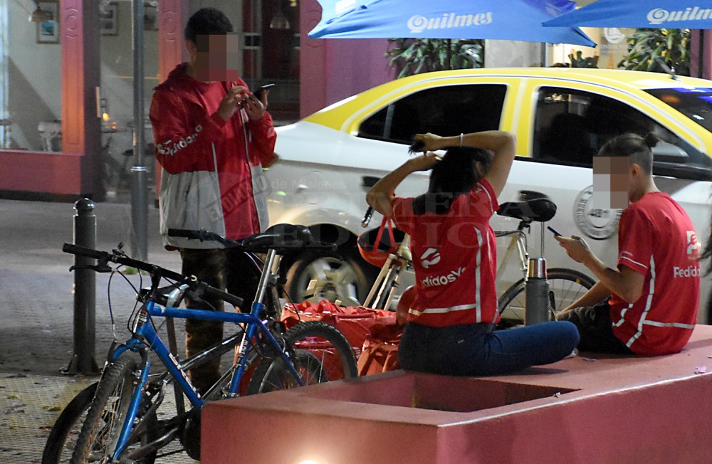 Es habitual verlos instalados en los principales paseos públicos y centros comerciales a la espera de un mensaje, sin importar las condiciones del clima. Si llega el pedido, será la forma en que se ganarán unos pesos por recorrer en bicicleta (algunos en moto) el tramo entre una casa de comidas (rotiserías, bares, restaurantes) y un domicilio que solicitó el mismo.