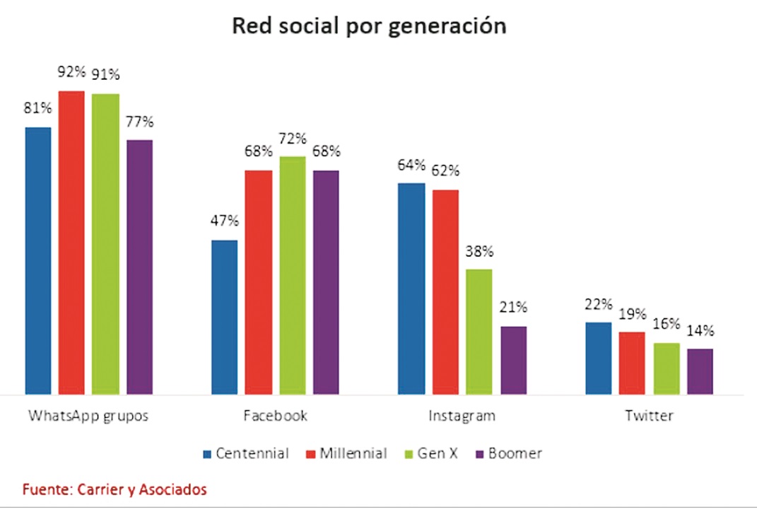 A este punto hay que considerarlo, por ejemplo, cuando se hace publicidad en Facebook. De hecho, desde Carrier & Asociados indicaron que entre los centennials, sólo llega al 47% frente a un 64% que usa Instagram.