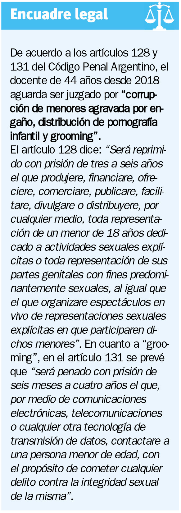 El docente de 44 años detenido en la comisaría de 25 de Mayo e imputado, una vez más, por delitos contra la integridad sexual, podría aguardar en las mismas condiciones de privación de su libertad hasta que se realice, ante los tres camaristas del Tribunal Penal 2 (TP-2) de Posadas, el juicio oral por “corrupción de menores agravada por engaño, distribución de pornografía infantil y grooming”, causa iniciada a mediados de 2016, tras la denuncia realizada por una madre posadeña que advirtió que su hijo adolescente estaba siendo víctima de acoso por parte de este sospechoso.