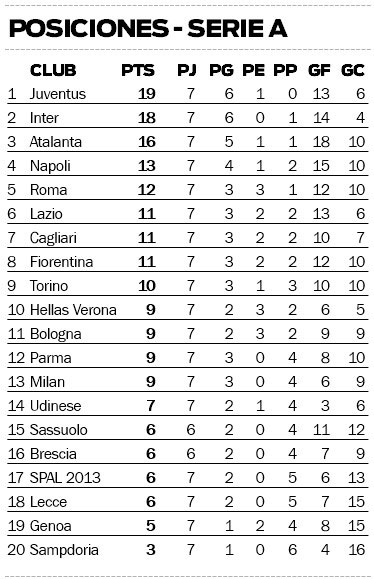 Tercero está el Atalanta, con 16 puntos tras vencer este domingo al Lecce por 3-1, con goles del colombiano Duván Zapata (35), del argentino Papu Gómez (40) y del alemán Robin Gosens (56).