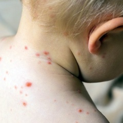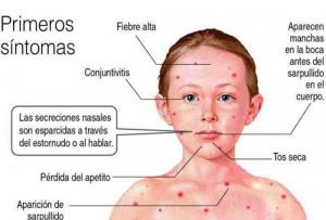 Afecta sobre todo a los niños y sus principales síntomas son fiebre alta, erupción en la cara y cuello que se va extendiendo al resto del cuerpo, secreción nasal, conjuntivitis y tos.