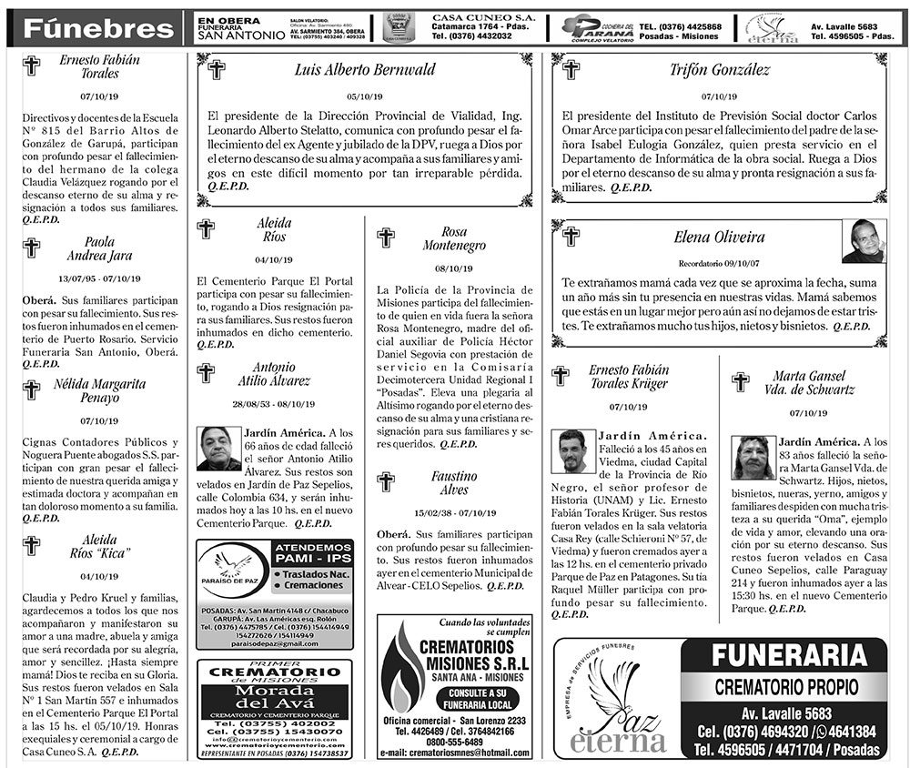 Fúnebres del miércoles 9 de octubre de 2019