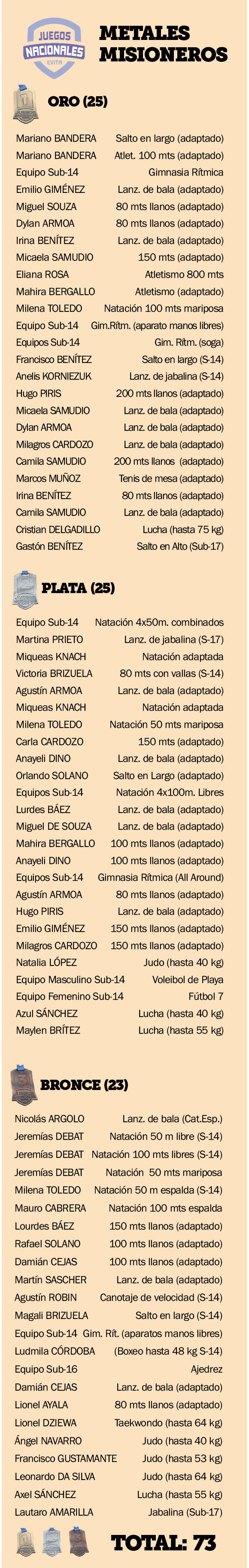Misiones logró una histórica cosecha de 73 medallas en total, de las cuales 25 fueron de oro, otras 25 de plata y 23 de bronce. Con los bolsos llenos de metales, la delegación emprendió este viernes el regreso a la provincia.