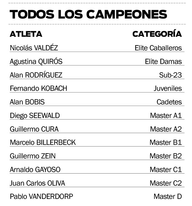 En tanto, en Sub-23 el campeón fue Alan Rodríguez, quien aventajó así a Federico Vera y Julián Gayoso, mientras que en Juveniles se coronó Fernando Kobach, por encima de Axel Pauluczek.