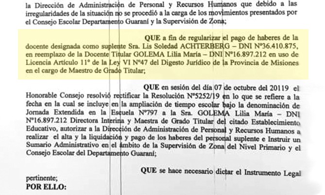 Asimismo, el CGE dio a conocer que aprobó la designación de la docente suplente Lis Soledad Achterberg quien no había percibido ningún mes de sus haberes.