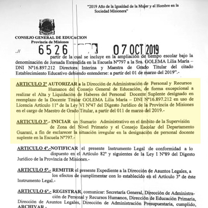 Todo esto, después de una larga espera, ya que recién el 7 de octubre último el Presidente del CGE, Mauricio Maidana, firmó la Resolución N° 6526 en la cual ratifica la Resolución N° 5252/19 y “Autoriza a la Dirección de Personal y Recursos Humanos del Consejo General de Educación, de forma excepcional realizar el alta y liquidación de haberes el personal docente suplente designado en reemplazo de la docente … en uso de la licencia Artículo N° 11 de la Ley VI N° 47”. Por su parte, Sartori aseguró que la resolución avala lo realizado por él y que “obré según la reglamentación vigente”.