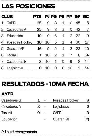 En el otro partido de la fecha, Cazadores B hizo de local en Federación ante Posadas Hockey. El otro equipo de Centro suma sólo tres puntos, producto de una única victoria, y está en el fondo de la tabla. Posadas Hockey, por su parte, llegó en la quinta posición, dispuesto a dar pelea.