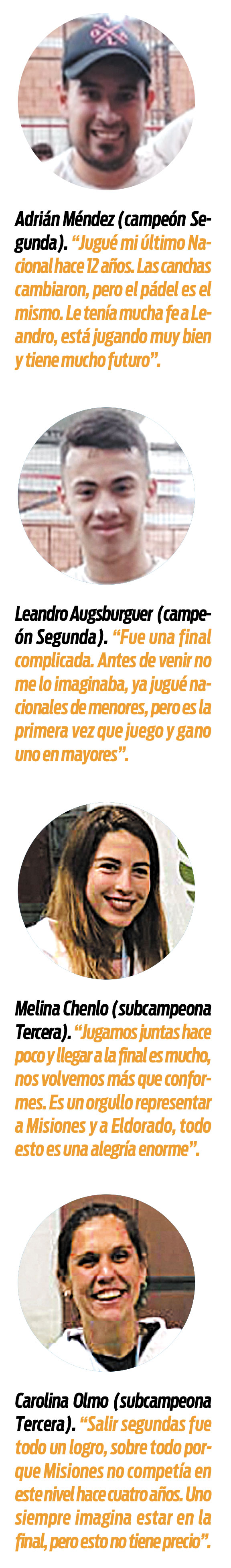 Después de cuatro años de ausencia, Misiones volvió a competir en el plano nacional. Y lo que en principio era una experiencia para medir el nivel de los padlistas locales terminó en utopía: una de las parejas se consagró campeona nacional en Segunda Caballeros, mientras que en Tercera Damas, las chicas de la tierra colorada fueron subcampeonas.