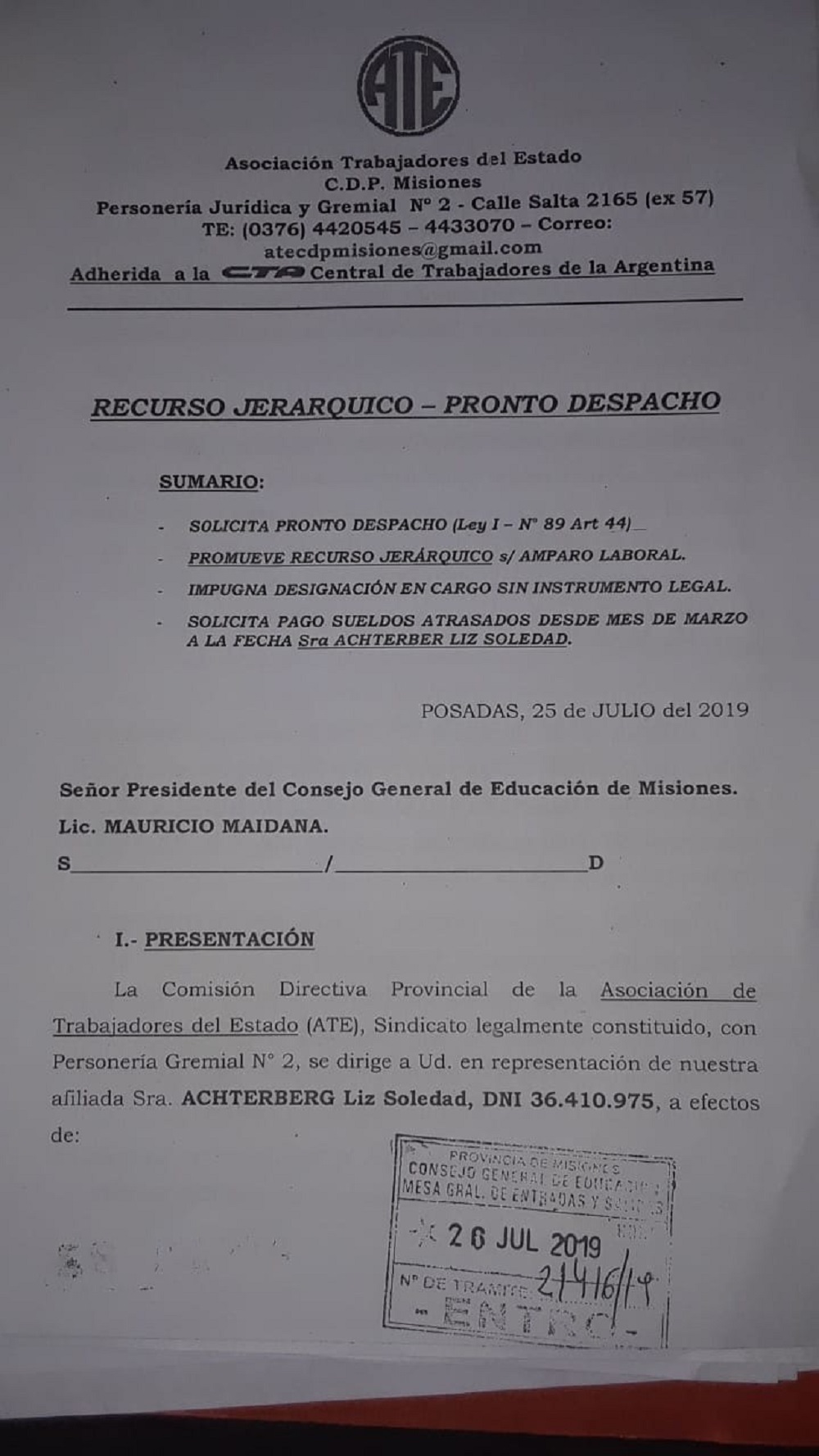 Con el patrocinio del abogado Miguel Ángel Almeida Inass, la docente Liz Soledad Achterberg elevó, el 27 de julio último, una nota de pronto despacho al presidente del CGE, Mauricio Maidana, en la cual expuso los hechos en los que se vio envuelta y solicitó que en virtud de la buena fe, el correcto procedimiento y en estricto cumplimiento de la normativa que rige la actividad docente de Misiones, “se efectivicen los salarios adeudados: proporcional mes de marzo y sueldos completos meses de abril a la fecha de liquidación de los mismos, el proporcional aguinaldo; se otorgue al presente carácter preferente Despacho en amparo por razones salariales y alimentarias de gestante de alto riesgo”, y que “se investigue formalmente el atraso salarial injustificado”. Todo sigue en la nada.