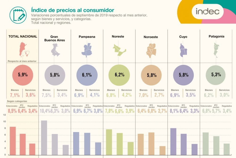 La inflación de septiembre pasado fue del 5,9%, informó esta tarde el Instituto Nacional de Estadística y Censos (INDEC), como consecuencia directa de la devaluación producida tras las PASO.